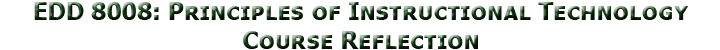 At the same time I engaged in Principles of Distance Education (EDD 7007), I was also engaging in Principles of Instructional Technology (EDD 8008). Similar to EDD 7007, I entered EDD 8008 with a preconception. For this course, my conception was that instructional technology was limited to electronic means such as video and audio. Within the first two weeks of this course, this conception was altered. Through the initial readings about the history of technology and education, I quickly recognized that technology represents any and all means of communicating information, most significantly recognizing that books are a form of technology. Similar to the definition of distance education that was discussed in EDD 7007, was the discussion about the definition of instructional technology in this course. The definition discussed was the 1994 Association for Educational Communications and Technology (AECT) definition. “Instructional technology is the theory and practice of design, development, utilization, management and evaluation of processes and resources for learning” (Seels, B. & Richey, R, 1994). This definition was at the forefront of the first class discussion. Dr. Schlosser asked each of us to critically analyze the definition in respect to its validity and influence. Generally, I concluded that this definition was appropriate for the time due to the fact that it clearly appears to be an evolutionary definition which respects the past, supports the present, and plans for the future. This course also represented my first formal exposure to educational theories. In piecemeal ways during my career I had been exposed to behaviorism, cognitivism, and constructivism, although I had never done any formal reading about them. After completing this section of the course, I adopted the philosophy that no single theory is better than another and that a combination of each theory’s principles may offer the best educational experience. |