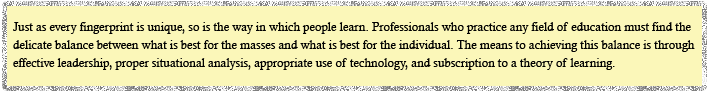 This experience is one that has influenced me more than I could ever have imagined. Not only did I learn much about instructional technology and distance education, I also learned about myself, learned about my colleagues, learned about the organizations I am a part of, and met some wonderful people along the way. This time of my life will never be forgotten and has helped shape where my life will lead. This portfolio has offered me the opportunity to reflect back on the four semesters of my Masters degree. While looking back through old assignments and discussion postings memories returned. Most memories caused moments of joy and humor, but some caused me to think about my career and how I have grown in this relatively short period of time. The intent of this portfolio is to illustrate my growth to all who choose to peruse through. To begin, I present to you my newly discovered statement of philosophy. As you navigate around my portfolio you will find reflections for each course I completed as part of the degree. In addition to these reflections, all of my assignments are available on a second page for that course. Examples of my professional growth are found on the same page as the coursework. I hope you enjoy reviewing my journey as much as I have enjoyed completing it. As one final thought for this foreword, I would like to express my gratitude to the following individuals who have played a significant role in my development. Without the presence of these individuals my experience would have been much different, and although no one knows for certain, it may not have turned out so well. Dr. CS, Debbie, Peggy, Sue, Rae, Alejandra, Dusti, Andy, and JSR |